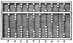 An abacus (pl. abaci or abacuses), also called a counting frame, is a hand-operated calculating tool which was used from ancient times in the ancient Near East, Europe, China, and Russia, until the adoption of the Hindu–Arabic numeral system.[1] An abacus consists of a two-dimensional array of slidable beads (or similar objects). In their earliest designs, the beads could be loose on a flat surface or sliding in grooves. Later the beads were made to slide on rods and built into a frame, allowing faster manipulation.