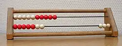 The red-and-white abacus is used in contemporary primary schools for a wide range of number-related lessons. The twenty bead version, referred to by its Dutch name rekenrek ("calculating frame"), is often used, either on a string of beads or on a rigid framework.[56]