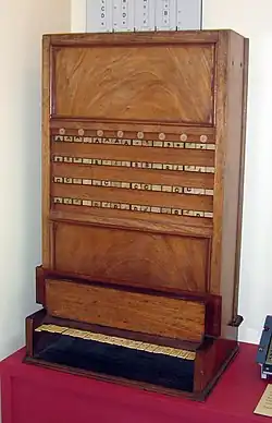 The earliest logical machines were mechanical constructs built in the late 19th century. William Stanley Jevons invented the first logical machine in 1869, the logic piano.[6] In 1883, Allan Marquand invented a new logical machine that performed the same operations as Jevons' logic piano but with improvements in design simplification, portability, and input-output controls.[7]