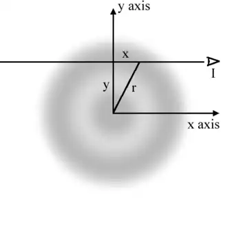 where f(r) is the circularly symmetric function represented by the gray color in the figure. It is assumed that the observer is actually at x = ∞, so that the limits of integration are ±∞, and all lines of sight are parallel to the x axis. Realizing that the radius r is related to x and y as r2 = x2 + y2, it follows that