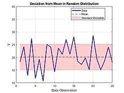In mathematics and statistics, deviation serves as a measure to quantify the disparity between an observed value of a variable and another designated value, frequently the mean of that variable. Deviations with respect to the sample mean and the population mean (or "true value") are called errors and residuals, respectively. The sign of the deviation reports the direction of that difference: the deviation is positive when the observed value exceeds the reference value. The absolute value of the deviation indicates the size or magnitude of the difference. In a given sample, there are as many deviations as sample points. Summary statistics can be derived from a set of deviations, such as the standard deviation and the mean absolute deviation, measures of dispersion, and the mean signed deviation, a measure of bias.[1]