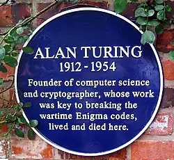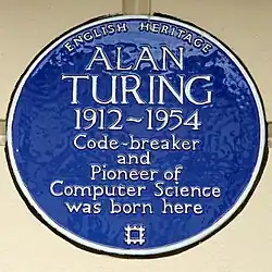 Turing's father's civil service commission was still active during Turing's childhood years, and his parents travelled between Hastings in the United Kingdom[26] and India, leaving their two sons to stay with a retired Army couple. At Hastings, Turing stayed at Baston Lodge, Upper Maze Hill, St Leonards-on-Sea, now marked with a blue plaque.[27] The plaque was unveiled on 23 June 2012, the centenary of Turing's birth.[28]