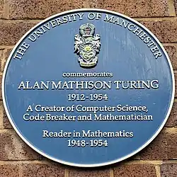 In 1948, Turing was appointed reader in the Mathematics Department at the University of Manchester. He lived at "Copper Folly", 43 Adlington Road, in Wilmslow.[139] A year later, he became deputy director of the Computing Machine Laboratory, where he worked on software for one of the earliest stored-program computers—the Manchester Mark 1. Turing wrote the first version of the Programmer's Manual for this machine, and was recruited by Ferranti as a consultant in the development of their commercialised machine, the Ferranti Mark 1. He continued to be paid consultancy fees by Ferranti until his death.[140] During this time, he continued to do more abstract work in mathematics,[141] and in "Computing Machinery and Intelligence",[142] Turing addressed the problem of artificial intelligence, and proposed an experiment that became known as the Turing test, an attempt to define a standard for a machine to be called "intelligent". The idea was that a computer could be said to "think" if a human interrogator could not tell it apart, through conversation, from a human being.[143] In the paper, Turing suggested that rather than building a program to simulate the adult mind, it would be better to produce a simpler one to simulate a child's mind and then to subject it to a course of education. A reversed form of the Turing test is widely used on the Internet; the CAPTCHA test is intended to determine whether the user is a human or a computer.