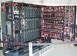 In July 1942, Turing devised a technique termed Turingery (or jokingly Turingismus[121]) for use against the Lorenz cipher messages produced by the Germans' new Geheimschreiber (secret writer) machine. This was a teleprinter rotor cipher attachment codenamed Tunny at Bletchley Park. Turingery was a method of wheel-breaking, i.e., a procedure for working out the cam settings of Tunny's wheels.[122] He also introduced the Tunny team to Tommy Flowers who, under the guidance of Max Newman, went on to build the Colossus computer, the world's first programmable digital electronic computer, which replaced a simpler prior machine (the Heath Robinson), and whose superior speed allowed the statistical decryption techniques to be applied usefully to the messages.[123] Some have mistakenly said that Turing was a key figure in the design of the Colossus computer. Turingery and the statistical approach of Banburismus undoubtedly fed into the thinking about cryptanalysis of the Lorenz cipher,[124][125] but he was not directly involved in the Colossus development.[126]