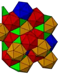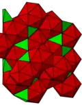 This honeycomb is represented in the boron atoms of the α-rhombohedral crystal. The centers of the icosahedra are located at the fcc positions of the lattice.[2]