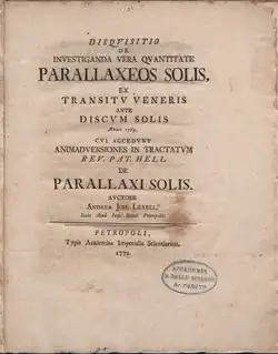 - ↑ A. J. Lexell (1772). Disquisitio de investiganda vera quantitate parallaxeos solis, et transitu Veneris ante discum solis anno 1769, cui accedunt anumadversiones in tractatum rev. pat. Hell de parallaxi solis. p. 131.