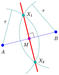 Because the construction of the bisector is done without the knowledge of the segment's midpoint , the construction is used for determining as the intersection of the bisector and the line segment.