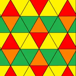 In geometry, a uniform coloring is a property of a uniform figure (uniform tiling or uniform polyhedron) that is colored to be vertex-transitive. Different symmetries can be expressed on the same geometric figure with the faces following different uniform color patterns.