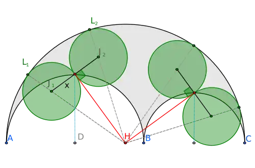 Then, create two circles with centers Ji perpendicular to HE, tangent to the large semicircle at point Li, tangent to point E, and with equal radii x. Using the Pythagorean theorem: