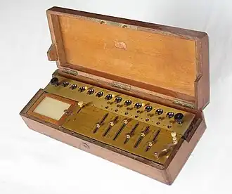 The arithmometers of this period were four-operation machines; a multiplicand inscribed on the input sliders could be multiplied by a single-digit multiplier by simply pulling on a ribbon (quickly replaced by a crank handle). It was a complicated design[8] and very few machines were built. Additionally, no machines were built between 1822 and 1844.