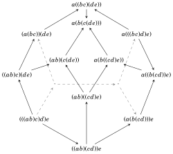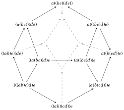 In mathematics, an associahedron Kn is an (n – 2)-dimensional convex polytope in which each vertex corresponds to a way of correctly inserting opening and closing parentheses in a string of n letters, and the edges correspond to single application of the associativity rule. Equivalently, the vertices of an associahedron correspond to the triangulations of a regular polygon with n + 1 sides and the edges correspond to edge flips in which a single diagonal is removed from a triangulation and replaced by a different diagonal. Associahedra are also called Stasheff polytopes after the work of Jim Stasheff, who rediscovered them in the early 1960s[1] after earlier work on them by Dov Tamari.[2]