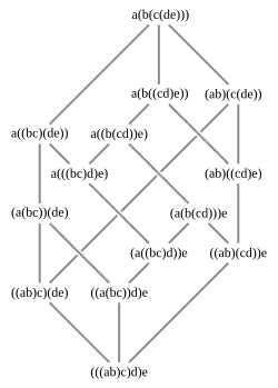 The number of possible bracketings is just the Catalan number, , for n operations on n+1 values. For instance, a product of 3 operations on 4 elements may be written (ignoring permutations of the arguments), in possible ways: