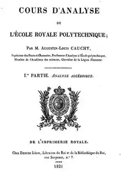 He was the first to prove Taylor's theorem rigorously, establishing his well-known form of the remainder.[4] He wrote a textbook[25] (see the illustration) for his students at the École Polytechnique in which he developed the basic theorems of mathematical analysis as rigorously as possible. In this book he gave the necessary and sufficient condition for the existence of a limit in the form that is still taught. Also Cauchy's well-known test for absolute convergence stems from this book: Cauchy condensation test. In 1829 he defined for the first time a complex function of a complex variable in another textbook.[26] In spite of these, Cauchy's own research papers often used intuitive, not rigorous, methods;[27] thus one of his theorems was exposed to a "counter-example" by Abel, later fixed by the introduction of the notion of uniform continuity.