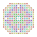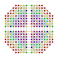 These 64 polytopes are each shown in these 8 symmetry planes, with vertices and edges drawn, and vertices colored by the number of overlapping vertices in each projective position.