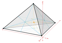 Barycentric coordinates may be easily extended to three dimensions. The 3D simplex is a tetrahedron, a polyhedron having four triangular faces and four vertices. Once again, the four barycentric coordinates are defined so that the first vertex maps to barycentric coordinates , , etc.