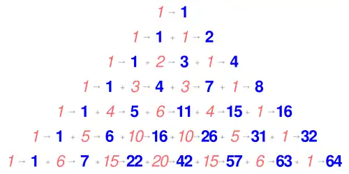 Similarly to Pascal's triangle, each component of Bernoulli's triangle is the sum of two components of the previous row, except for the last number of each row, which is double the last number of the previous row. For example, if denotes the component in row n and column k, then: