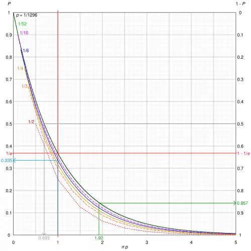 Grey curve: To get 50-50 chance of throwing a Yahtzee (5 cubic dice all showing the same number) requires 0.69 × 1296 ~ 898 throws.