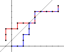 In Bertrand's original paper, he sketches a proof based on a general formula for the number of favourable sequences using a recursion relation. He remarks that it seems probable that such a simple result could be proved by a more direct method. Such a proof was given by Désiré André,[6] based on the observation that the unfavourable sequences can be divided into two equally probable cases, one of which (the case where B receives the first vote) is easily computed; he proves the equality by an explicit bijection. A variation of his method is popularly known as André's reflection method, although André did not use any reflections.[7]
