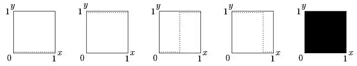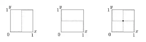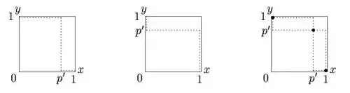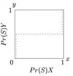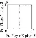 Response correspondences for all 2 × 2 normal form games can be drawn with a line for each player in a unit square strategy space. Figures 1 to 3 graphs the best response correspondences for the stag hunt game. The dotted line in Figure 1 shows the optimal probability that player Y plays 'Stag' (in the y-axis), as a function of the probability that player X plays Stag (shown in the x-axis). In Figure 2 the dotted line shows the optimal probability that player X plays 'Stag' (shown in the x-axis), as a function of the probability that player Y plays Stag (shown in the y-axis). Note that Figure 2 plots the independent and response variables in the opposite axes to those normally used, so that it may be superimposed onto the previous graph, to show the Nash equilibria at the points where the two player's best responses agree in Figure 3.