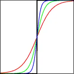 Instead of best response correspondences, some models use smoothed best response functions. These functions are similar to the best response correspondence, except that the function does not "jump" from one pure strategy to another. The difference is illustrated in Figure 8, where black represents the best response correspondence and the other colors each represent different smoothed best response functions. In standard best response correspondences, even the slightest benefit to one action will result in the individual playing that action with probability 1. In smoothed best response as the difference between two actions decreases the individual's play approaches 50:50.