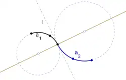 A biarc is a smooth curve formed from two circular arcs.[1] In order to make the biarc smooth (G1 continuous), the two arcs should have the same tangent at the connecting point where they meet.