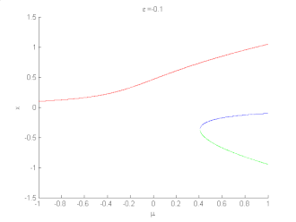 Symmetry breaking in pitchfork bifurcation as the parameter ε is varied. ε = 0 is the case of symmetric pitchfork bifurcation.