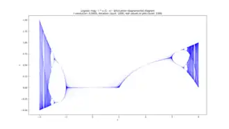 The bifurcation parameter r is shown on the horizontal axis of the plot and the vertical axis shows the set of values of the logistic function visited asymptotically from almost all initial conditions.