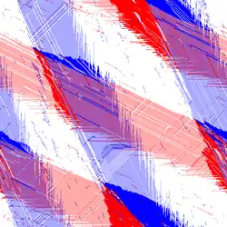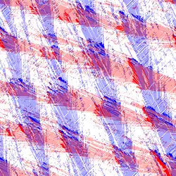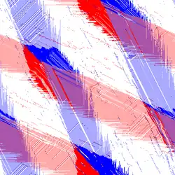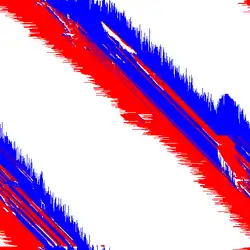 The Biham–Middleton–Levine traffic model is a self-organizing cellular automaton traffic flow model. It consists of a number of cars represented by points on a lattice with a random starting position, where each car may be one of two types: those that only move downwards (shown as blue in this article), and those that only move towards the right (shown as red in this article). The two types of cars take turns to move. During each turn, all the cars for the corresponding type advance by one step if they are not blocked by another car. It may be considered the two-dimensional analogue of the simpler Rule 184 model. It is possibly the simplest system exhibiting phase transitions and self-organization.[1]