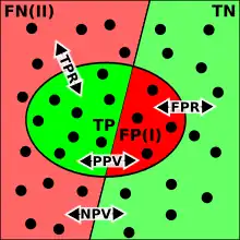 - with complement the false omission rate (FOR) (FN/(TN+FN)), also called dependence on prevalence.