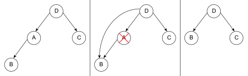 Suppose that the node to delete is node A. If A has no children, deletion is accomplished by setting the child of A's parent to null. If A has one child, set the parent of A's child to A's parent and set the child of A's parent to A's child.