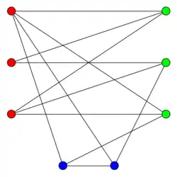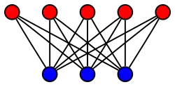 One often writes to denote a bipartite graph whose partition has the parts and , with denoting the edges of the graph. If a bipartite graph is not connected, it may have more than one bipartition;[5] in this case, the notation is helpful in specifying one particular bipartition that may be of importance in an application. If , that is, if the two subsets have equal cardinality, then is called a balanced bipartite graph.[3] If all vertices on the same side of the bipartition have the same degree, then is called biregular.
