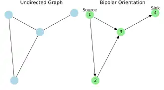 In graph theory, a bipolar orientation or st-orientation of an undirected graph is an assignment of a direction to each edge (an orientation) that causes the graph to become a directed acyclic graph with a single source s and a single sink t, and an st-numbering of the graph is a topological ordering of the resulting directed acyclic graph.[1][2]