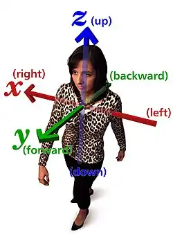 Body relative directions (also known as egocentric coordinates)[1] are geometrical orientations relative to a body such as a human person's body or a road sign. The most common ones are: left and right; forward and backward; up and down. They form three pairs of orthogonal axes.