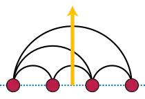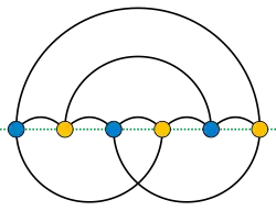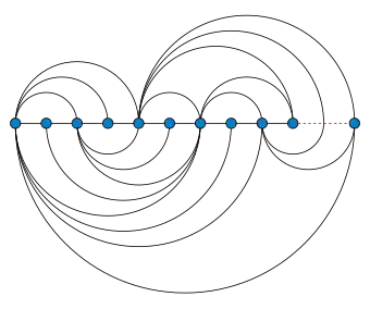 An arc diagram[54] or linear embedding[44] places vertices of a graph along a line, and draws the edges of the graph as semicircles either above or below this line, sometimes also allowing edges to be drawn on segments of the line. This drawing style corresponds to a book embedding with either one page (if all semicircles are above the line) or two pages (if both sides of the line are used), and was originally introduced as a way of studying the crossing numbers of graphs.[58][59] Planar graphs that do not have two-page book embeddings may also be drawn in a similar way, by allowing their edges to be represented by multiple semicircles above and below the line. Such a drawing is not a book embedding by the usual definition, but has been called a topological book embedding.[60] For every planar graph, it is always possible to find such an embedding in which each edge crosses the spine at most once.[61]