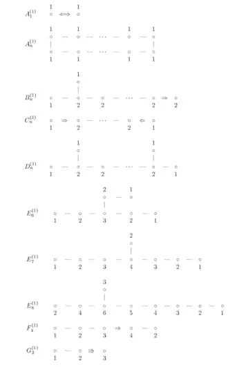 Let G be a connected simply connected compact simple Lie group with maximal torus T. Let be the Lie algebra of G and that of T. Let Δ be the corresponding root system. Choose a set of positive roots and corresponding simple roots α1, ..., αn. Let α0 the highest root in and write