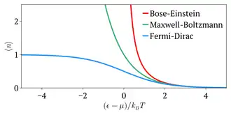 - In the limit of low particle density, , therefore or equivalently . In that case, , which is the result from Maxwell–Boltzmann statistics.