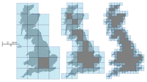 To calculate this dimension for a fractal , imagine this fractal lying on an evenly spaced grid and count how many boxes are required to cover the set. The box-counting dimension is calculated by seeing how this number changes as we make the grid finer by applying a box-counting algorithm.