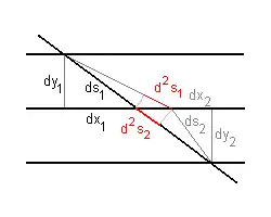 where the last part is the displacement for given change in time for 2nd differentials. Now consider the changes along the two neighboring paths in the figure below for which the horizontal separation between paths along the central line is d2x (the same for both the upper and lower differential triangles). Along the old and new paths, the parts that differ are,