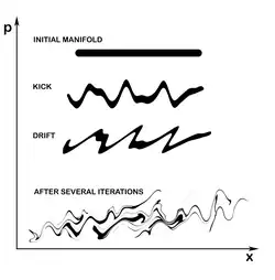 The dynamical mechanism that originates the branch formation can be understood by means of the kick and drift map, an area preserving map defined by: where n accounts for the discrete time, x and p are position and momentum respectively, and V is the potential. The equation for the momentum is called the “kick” stage, whereas the equation for the position is the “drift”. Given an initial manifold in phase space, it can be iterated under the action of the kick and drift map. Typically, the manifold stretches and folds (although keeping its total area constant) forming cusps or caustics and stable regions. These regions of phases space with high concentration of trajectories are precisely the branches.