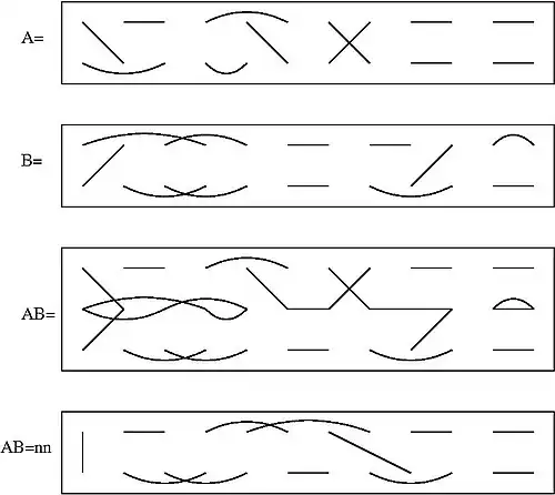 The product of two basis elements and is obtained by concatenation: first identifying the endpoints in the bottom row of and the top row of (Figure AB in the diagram), then deleting the endpoints in the middle row and joining endpoints in the remaining two rows if they are joined, directly or by a path, in AB (Figure AB=nn in the diagram). Thereby all closed loops in the middle of AB are removed. The product of the basis elements is then defined to be the basis element corresponding to the new pairing multiplied by where is the number of deleted loops. In the example .