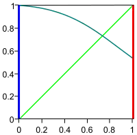 In one dimension, the result is intuitive and easy to prove. The continuous function f is defined on a closed interval [a, b] and takes values in the same interval. Saying that this function has a fixed point amounts to saying that its graph (dark green in the figure on the right) intersects that of the function defined on the same interval [a, b] which maps x to x (light green).