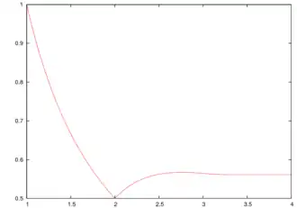 Graph of the Buchstab function ω(u) from u = 1 to u = 4.