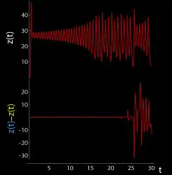 These figures show two segments of the three-dimensional evolution of two trajectories (one in blue, and the other in yellow) for the same period of time in the Lorenz attractor starting at two initial points that differ by only 10−5 in the x-coordinate. Initially, the two trajectories seem coincident, as indicated by the small difference between the z coordinate of the blue and yellow trajectories, but for t > 23 the difference is as large as the value of the trajectory. The final position of the cones indicates that the two trajectories are no longer coincident at t = 30. An animation of the Lorenz attractor shows the continuous evolution.