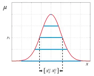 For fuzzy arithmetic[7] only a finite number of discrete affiliation stages are considered. The form of such a distribution for an indistinct value can then be represented by a sequence of intervals.