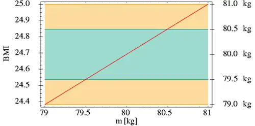 Height and body weight both affect the value of the BMI. Though the example above only considered variation in weight, height is also subject to uncertainty. Height measurements in meters are usually rounded to the nearest centimeter: a recorded measurement of 1.79 meters represents a height in the interval . Since the BMI uniformly increases with respect to weight and decreases with respect to height, the error interval can be calculated by substituting the lowest and highest values of each interval, and then selecting the lowest and highest results as boundaries. The BMI must therefore exist in the interval