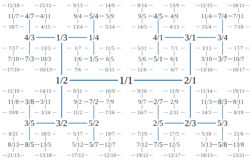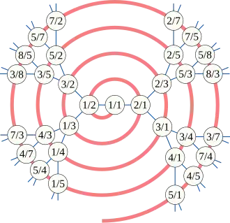 - ↑ The description here is dual to the original definition by Calkin and Wilf, which begins by defining the child relationship and derives the parent relationship as part of a proof that every rational appears once in the tree. As defined here, every rational appears once by definition, and instead the fact that the resulting structure is a tree requires a proof.