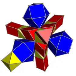 The cantellated 5-cell or small rhombated pentachoron is a uniform 4-polytope. It has 30 vertices, 90 edges, 80 faces, and 20 cells. The cells are 5 cuboctahedra, 5 octahedra, and 10 triangular prisms. Each vertex is surrounded by 2 cuboctahedra, 2 triangular prisms, and 1 octahedron; the vertex figure is a nonuniform triangular prism.