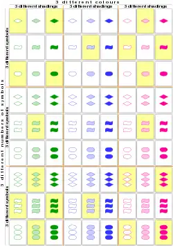 An example of cap sets comes from the card game Set, a card game in which each card has four features (its number, symbol, shading, and color), each of which can take one of three values. The cards of this game can be interpreted as representing points of the four-dimensional affine space , where each coordinate of a point specifies the value of one of the features. A line, in this space, is a triple of cards that, in each feature, are either all the same as each other or all different from each other. The game play consists of finding and collecting lines among the cards that are currently face up, and a cap set describes an array of face-up cards in which no lines may be collected.[1][5][6]
