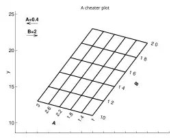 A carpet plot with two independent variables and one dependent variable is often called a cheater plot for the use of a phantom "cheater" axis instead of the horizontal axis. As a result of this missing axis, the values can be shifted horizontally such that the intersections line up vertically. This allows easy interpolation by having fixed horizontal intervals correspond to fixed intervals in both independent variables. The horizontal shift must sometimes be adjusted in order to eliminate or mitigate overlapping.[4] Depending on the data being depicted, eliminating overlapping is not always possible. The common solution is to split the plot into two carpets.