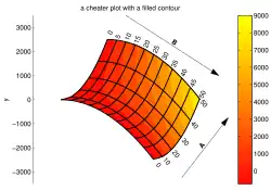 To add an additional dependent variable, isolines that are a function of the two independent variables can be added within the carpet to create a contour plot in the carpet domain. Contours can be added to cheater plots as well as to true carpet plots.[6]